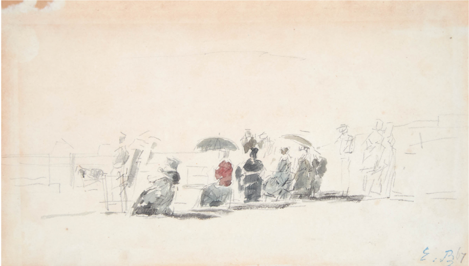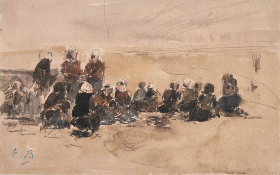 Eugène Boudin, Bords de mer, pecheuses assises sur la plage de Berck, Pas-de-Calais, Pencil and watercolour on wove paper laid on board, stamped E.B.