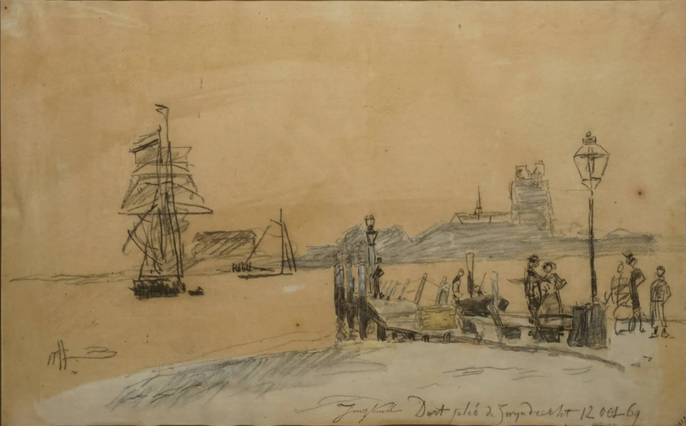 Johan-Barthold Jongkind, Quai animé et jetée à Dort, 12 oct. 69, Charcoal, black crayon, pencil and watercolour on paper, 1869